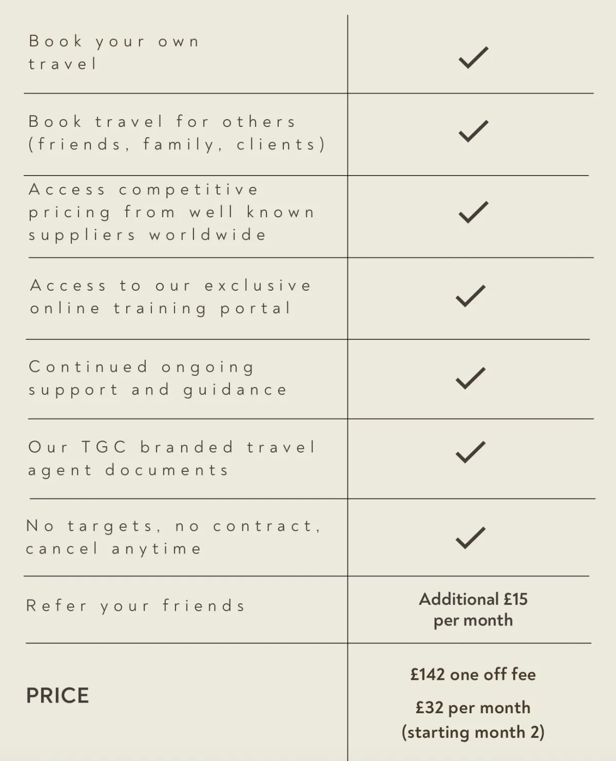 The refer a friend scheme is an ‘add on’, it costs an extra £15 a month. By joining the scheme, you can then share TGC with people you know, so that they can also access competitive pricing and earn commission from booking holidays. It is simple... you love TGC, you share TGC and you get paid weekly and monthly to say thank you for spreading the word!